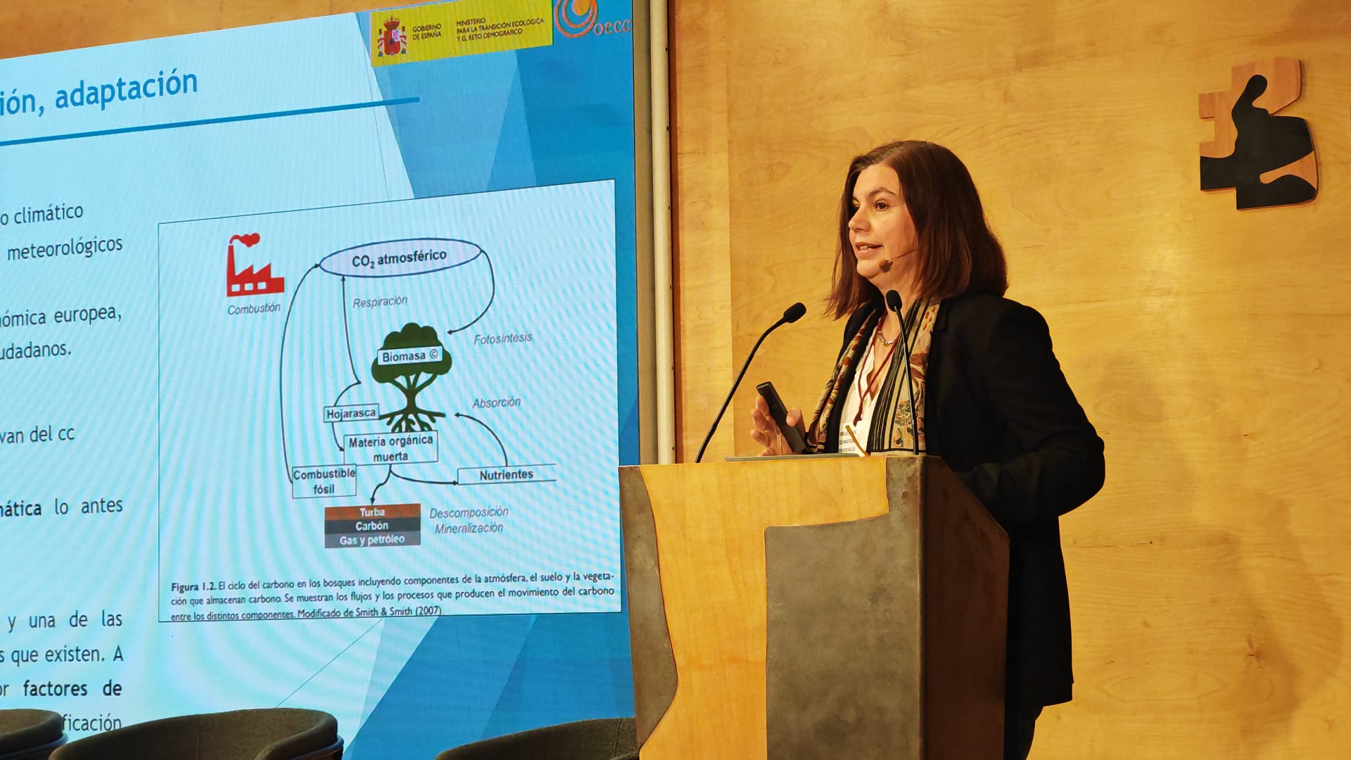 Elena Pita, Directora General de Oficina Española de Cambio Climático (OECC), hacía una contextualización del evento mencionando el Real Decreto que crea el registro de huella de carbono, compensación y proyectos de absorción de dióxido de carbono, recientemente aprobado el 18 de marzo. El mensaje principal que la directora general quiso subrayar es que el sector forestal no es solo una cifra de carbono secuestrado, sino que son todos los cobeneficios que hay alrededor de un bosque sano. Elena Pita finalizaba su intervención señalando la relevancia del evento para fomentar la colaboración y el diálogo entre los distintos agentes que tenemos entre todos que impulsar la transición ecológica.
