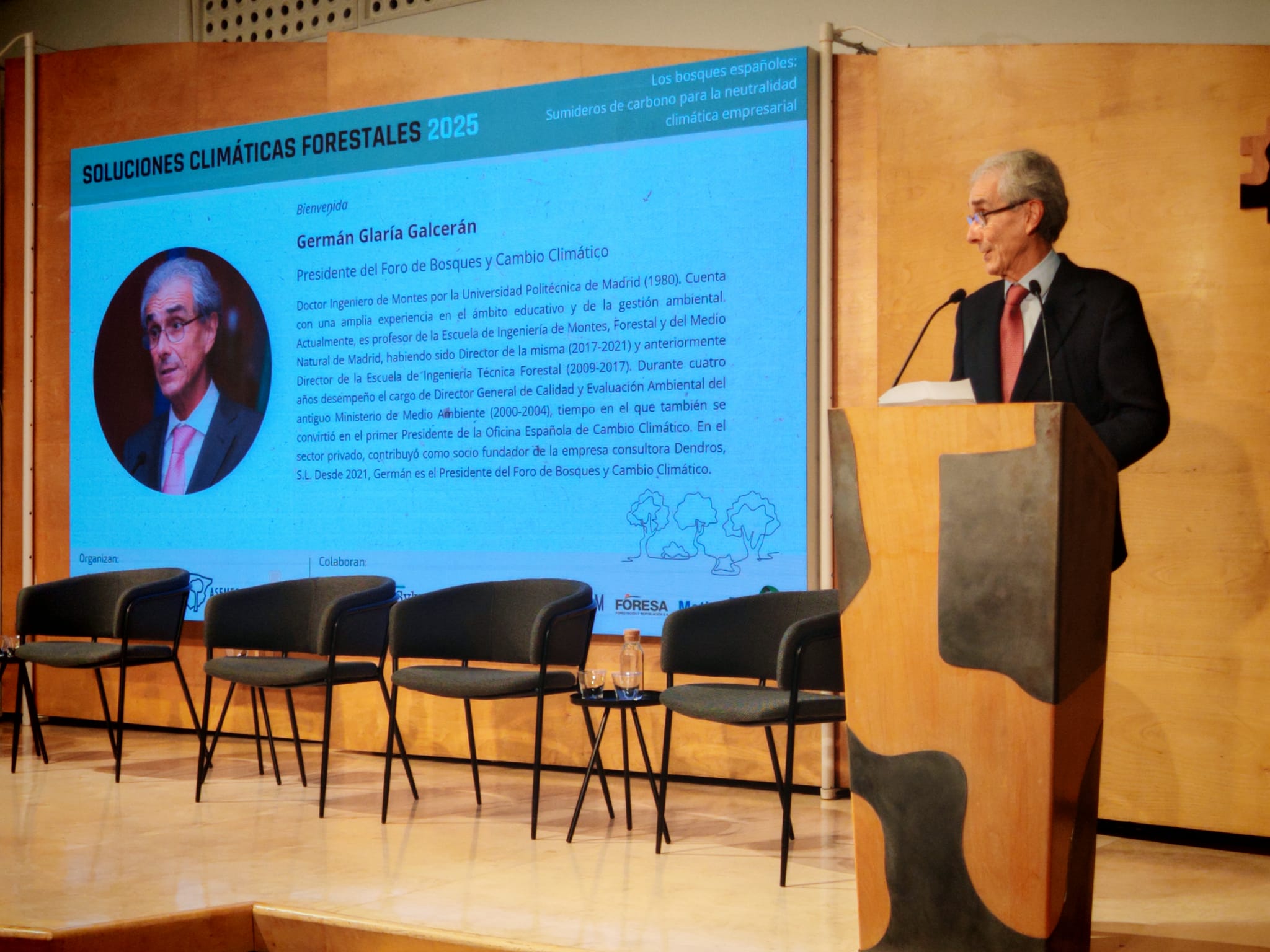 El presidente del Foro de Bosques y Cambio Climático, Germán Glaría, fue el encargado de dar la bienvenida a los asistentes en una sala con aforo completo, subrayando el creciente interés que despierta esta jornada, que celebra ya su segunda edición tras la primera celebrada en 2023. Destacó la notable participación de un público comprometido y especialmente interesado en conocer las soluciones que el sector forestal puede ofrecer ante las crecientes exigencias del sector empresarial en materia de descarbonización.