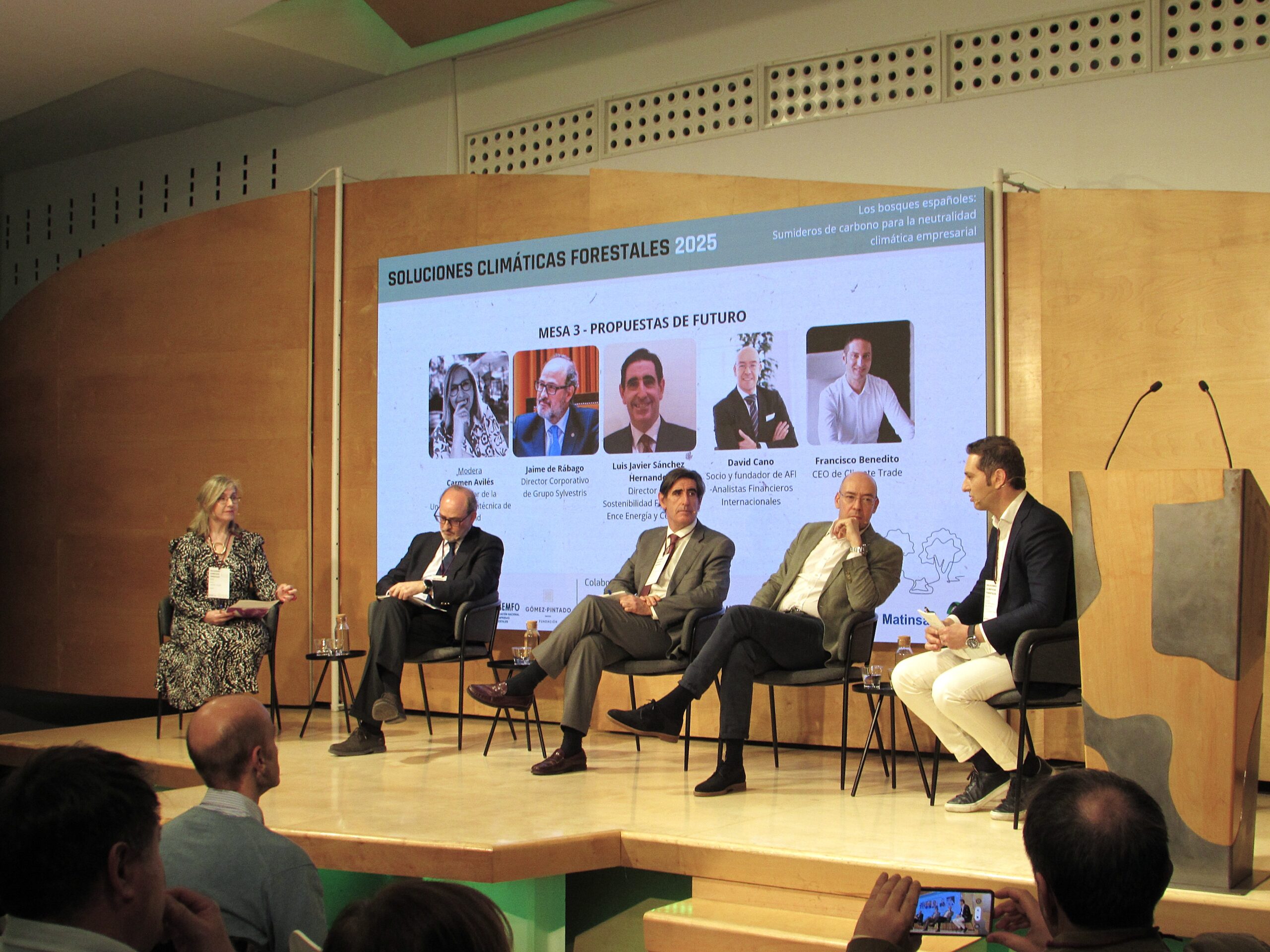 La última mesa, moderada por Carmen Avilés, Profesora Titular de la Universidad Politécnica de Madrid, se centró en las propuestas de futuro. En ella participaron representantes de distintos sectores clave para el impulso de las soluciones climáticas forestales: Jaime de Rábago, director corporativo de Grupo Sylvestris; Luis Javier Sánchez director de Sostenibilidad y Servicios Ecosistémicos de ENCE; David Cano, Socio y Fundador de AFI – Analistas Financieros Internacionales; y Francisco Benedito, CEO de Climate Trade. El debate puso sobre la mesa la importancia de fortalecer la colaboración entre los sectores forestal, financiero y empresarial en los próximos años, para dinamizar la inversión en proyectos de absorción de carbono y otros servicios ecosistémicos asociados a los bosques. Todos los ponentes coincidieron en que los bosques representan una oportunidad real y estratégica para avanzar hacia la sostenibilidad. Jaime de Rábago, de Grupo Sylvestris, resumía esta idea con claridad: “El dinero está, lo único que tiene que hacer es fijarse en nosotros”, transmitiendo la necesidad de colaboración y de comunicación entre el sector forestal y el financiero.