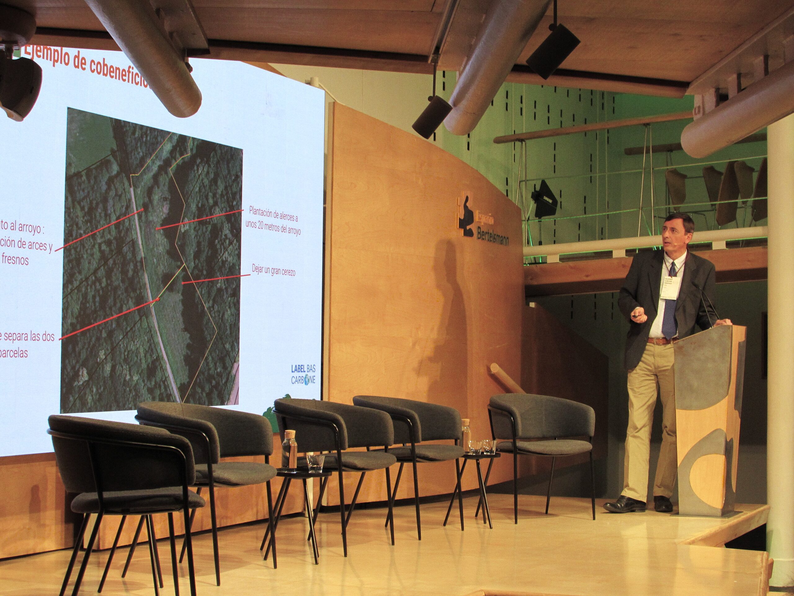 Durante la jornada, Araceli de Carlos Sebastián, directora de negocio de Carbon2Nature — empresa desarrolladora de proyectos de absorción de carbono de alta calidad tanto en España como en países como Brasil, Méjico y Australia — ofreció una visión general del estado actual de los mercados de carbono, aportando una perspectiva nacional e internacional. Su intervención sirvió de introducción al análisis más detallado del modelo francés, presentado por Roland de Lary, Director del Centro de la Propiedad Forestal de Francia. De Lary expuso ante los asistentes la experiencia de Francia con el estándar nacional de carbono francés “Label bas-carbone” (LBC), que se ha consolidado como una herramienta eficaz para incentivar proyectos forestales innovadores. El LBC contempla actualmente tres metodologías aplicables para el registro de proyectos: forestación, reconstitución de masas forestales degradadas y conversión de monte bajo en monte alto. Hasta 2025, el estándar cuenta con más de cinco millones de toneladas de CO₂ registradas, de las cuales aproximadamente la mitad proceden de proyectos forestales, lo que evidencia el papel clave del sector en la acción climática francesa.